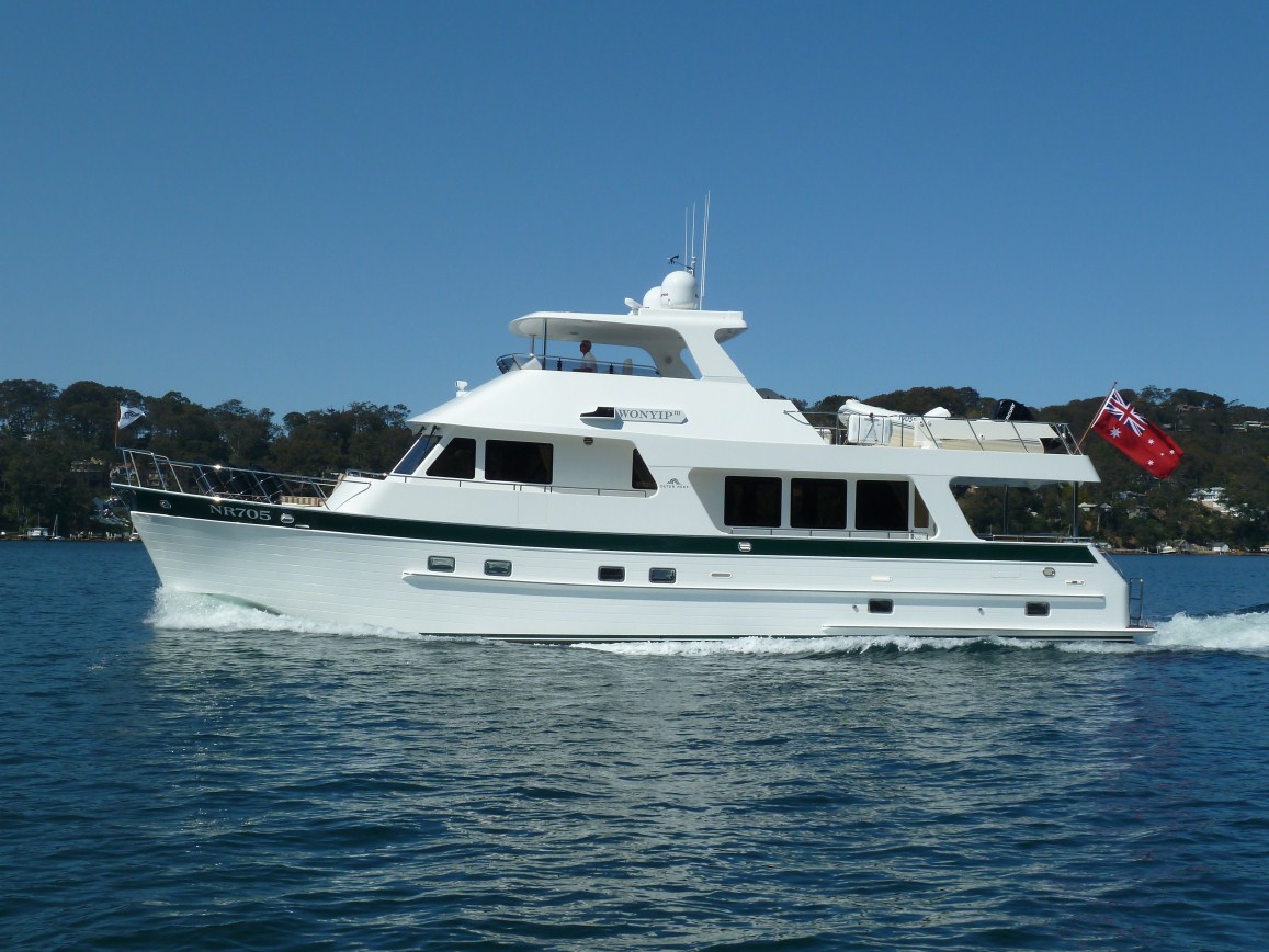 The coring, called Divinycell PVC, is 3/4 of an inch thick. The outer hull thickness above the solid hull lamination is about 3/8" to 1/2" thick. Then the coring and the FRP (Fiberglass Reinforced Polymer) inside over the coring is 1/4" to 3/8" thick. The result is an overall hull side thickness of about 1 1/2" to 1 3/4" thick.